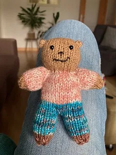This bear is knit in the round from the top down. Sleeves are created by increasing at each of the arms and then placing stitches on waste yarn once they total 12 stitches.