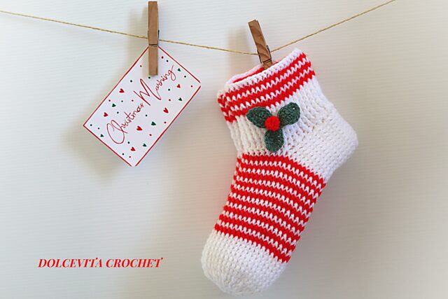 This festive, striped crochet stocking adds a classic and elegant touch to holiday decor.