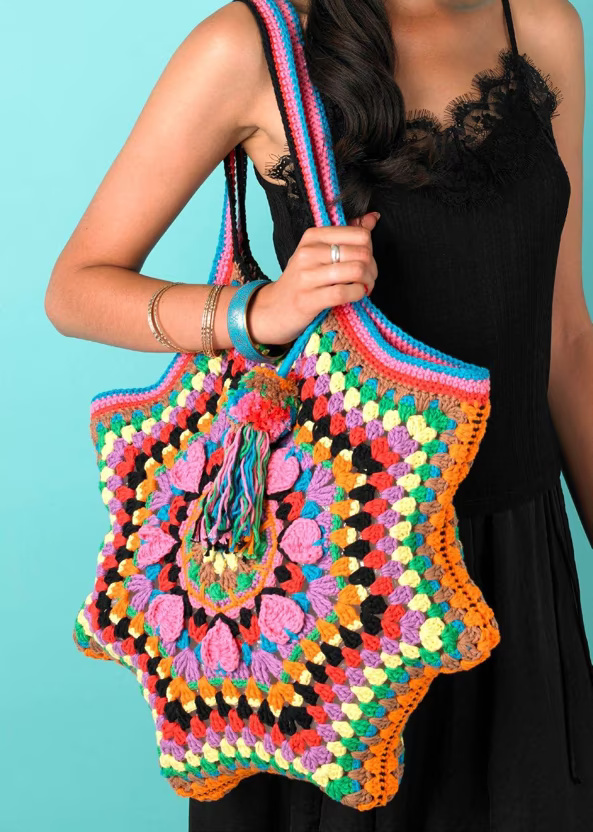 Crafted from a basic granny octagon, this energetic tote achieves its textured and deep appearance through overlay crochet.