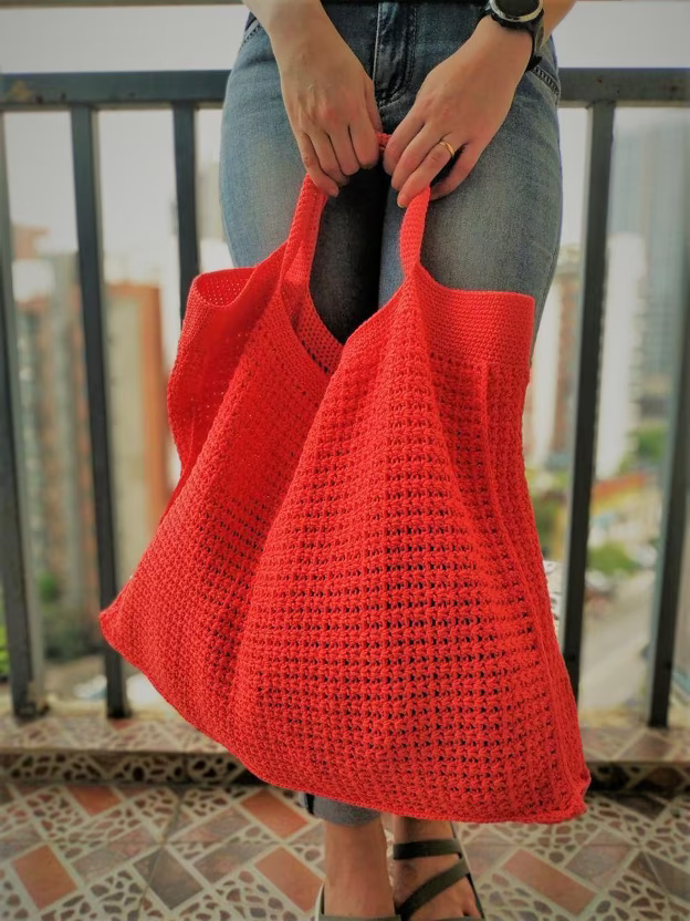 This lightweight crochet bag made from Red Heart Classic is a large beauty. It has the capacity to hold all your needs.