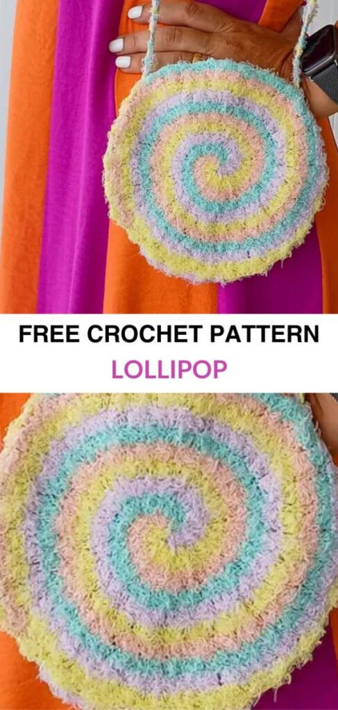 Check out this super cute lollipop-shaped bag! You crochet it in a spiral using four colors at once, switching between them in every round. It’s a total breeze to make and a lot of fun.