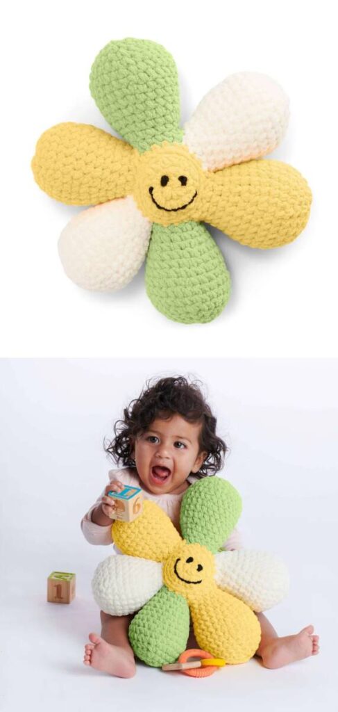 Give the nursery a cheerful boost with this bright crochet pillow, thoughtfully designed using Bernat Baby Blanket yarn.