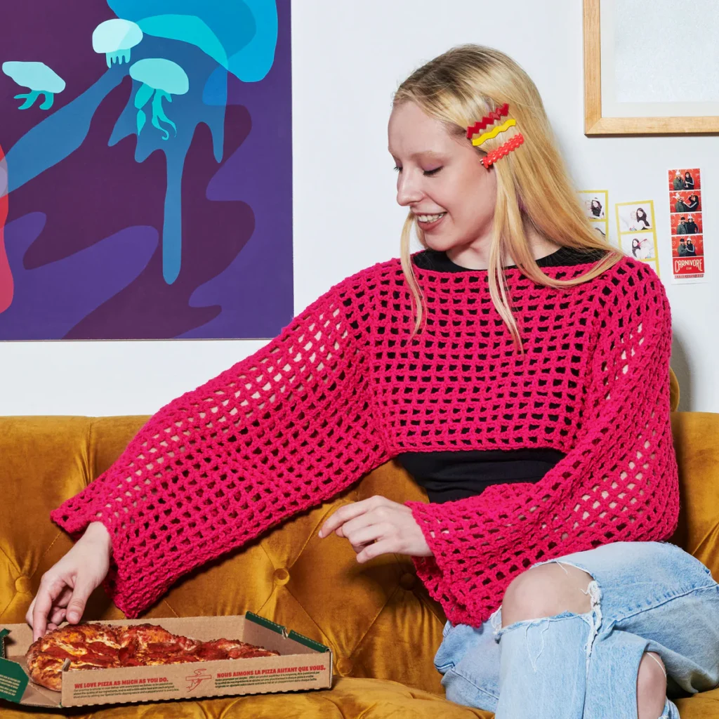 Create a fashion-forward mesh shrug effortlessly, as this design is achievable using the widely available Red Heart Super Saver yarn.