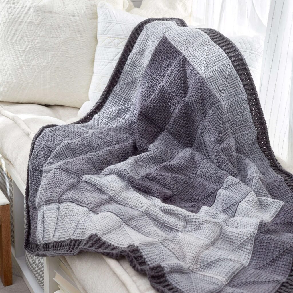 Create this beautiful lace-like crochet throw using either Bernat Plush or the multi-tonal Bernat Blanket Perfect Phasing yarn.