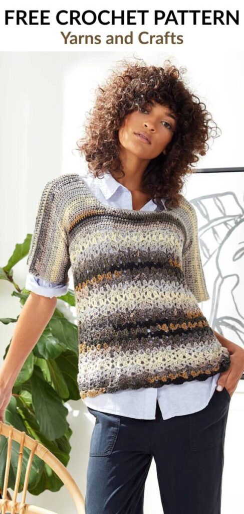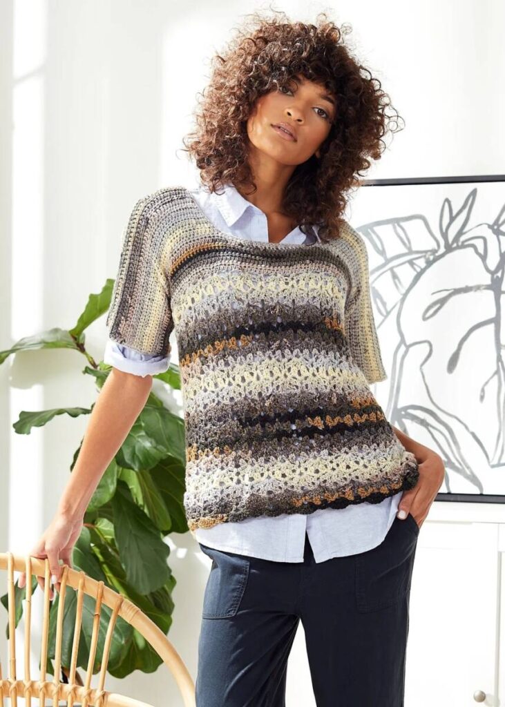 This crochet top is undeniably fun and eye-catching. The yarn’s fantastic self-striping effect ensures a beautiful color transition without the hassle of constantly changing skeins or weaving in extra ends.