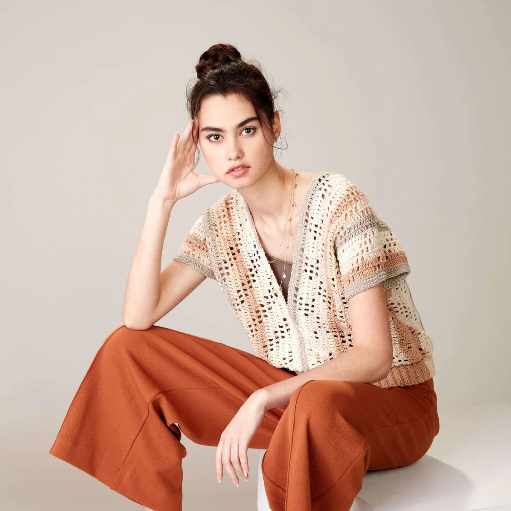 This readily available and affordable yarn ensures a quick-to-finish project that still looks high-quality. The resulting top is perfect for layering or wearing alone on a sunny day.