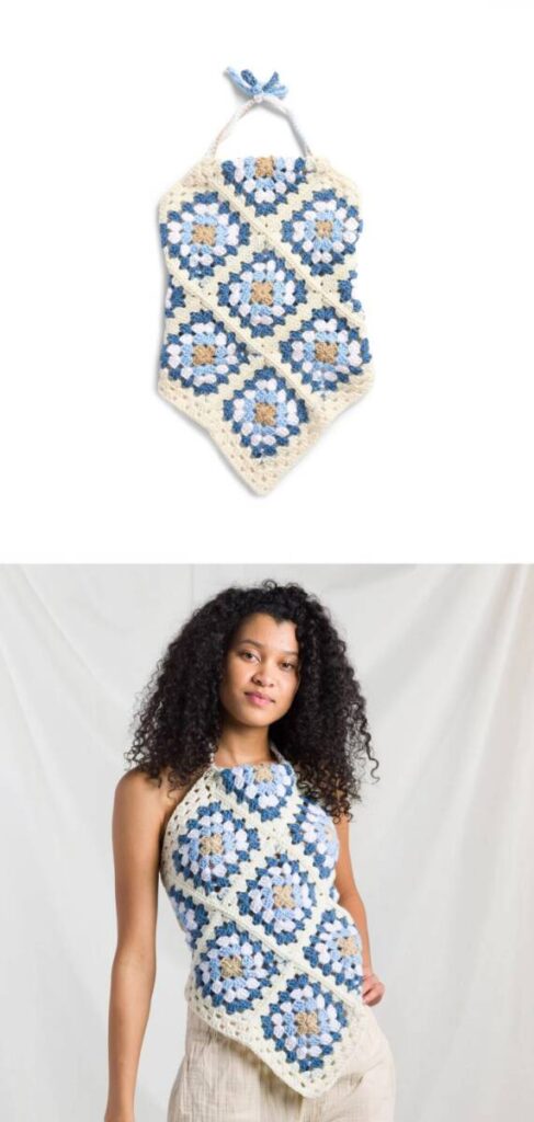 This captivating crochet halter top is constructed using a straightforward square motif.