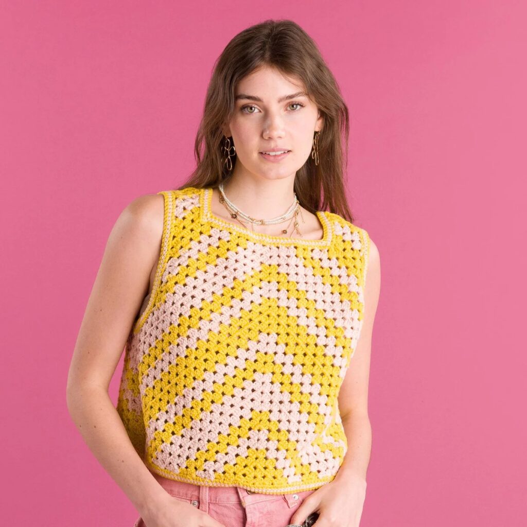 Showcase the charming appearance of this crochet tank top, which is made using Caron Blossom Cakes yarn.
