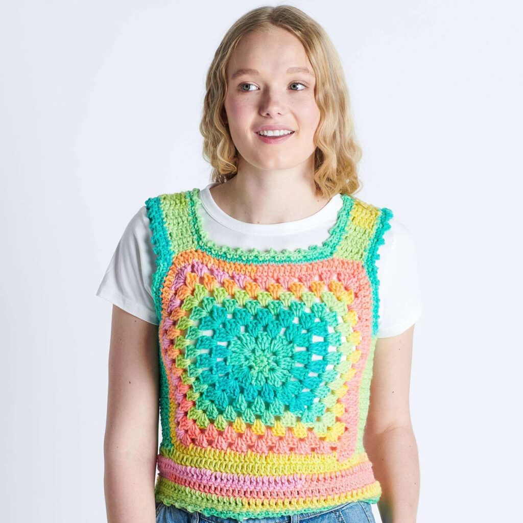 Inject some retro flair into your outfit by crafting this crochet top, which uses the vibrant Red Heart Super Saver Stripes yarn.