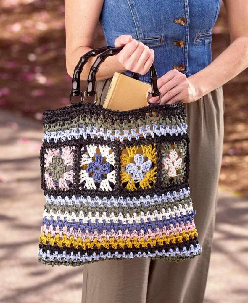 The bag, crafted from Premier Yarns Raffia, showcases a vibrant and intricate design by blending granny squares, striped patterns, and moss stitch.
