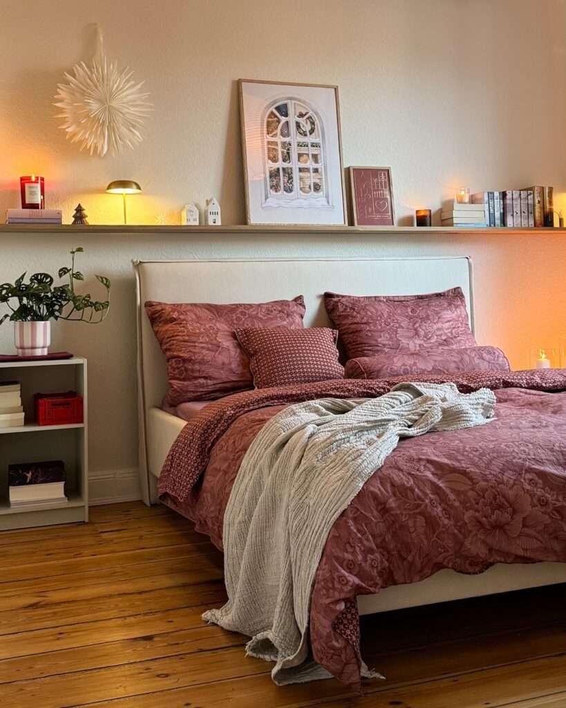 For this idea, it involves you placing a floating shelf above your bed, the distance between your bed’s headboards and the floating shelf depends on your preference.